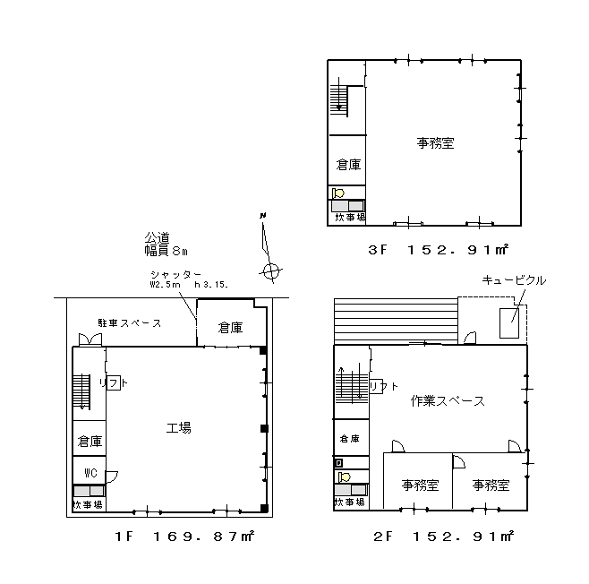 1階 169.87㎡/2階 152.91㎡/3階 152.91㎡